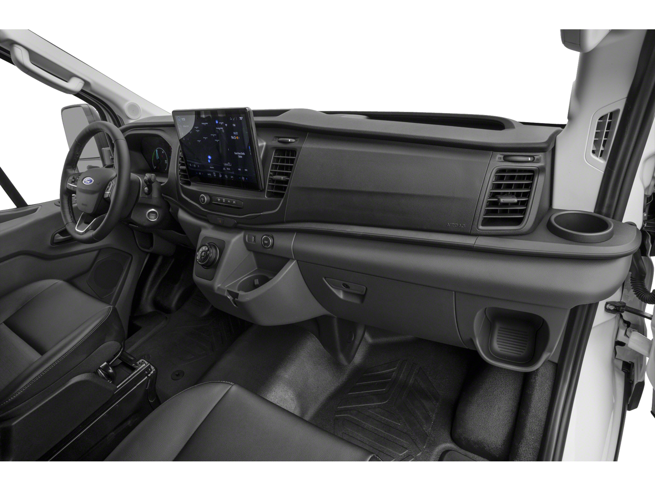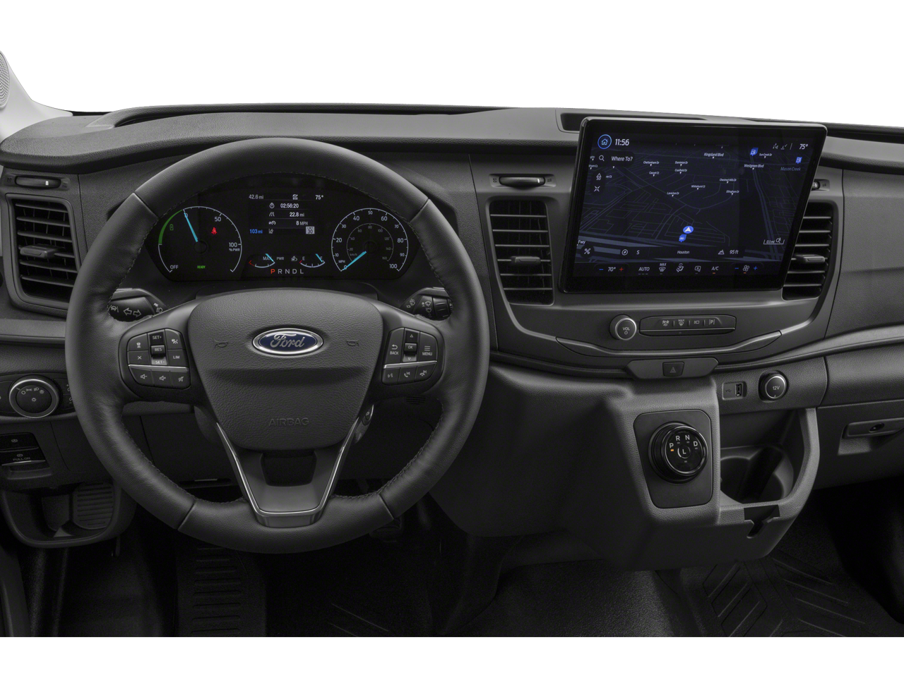 • Radio: AM/FM Stereo w/SYNC 4 -inc: 12" multi-function display, Bluetooth®, dual USB ports, embedded voice recognition, connected navigation w/3 years of service available through Ford Pro Intelligence, 4 speakers (front), Ford commercial solutions energy management and vehicle insight tools (access to the Ford charge network, public charging account setup and management, driver public charging tools, home charging reimbursement, Ford E-Telematics dashboard and connected navigation) included for commercial and business customers complimentary for 1 year